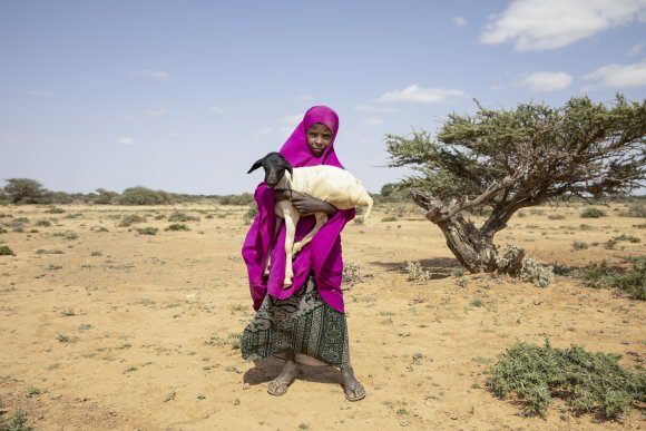 Las hermanas Deko (7 años, en la imagen) y Amina (14) forman parte de los niños y niñas que viven bajo la amenaza del hambre como consecuencia del cambio climático. Hijas de una familia desplazada de pastores nómadas de Somalia, la sequía de 2018 provocó que perdieran al menos 20 cabezas de ganado, empobreciéndose y teniendo que reducir su ingesta diaria notablemente (fotografías y testimonio completo aquí).