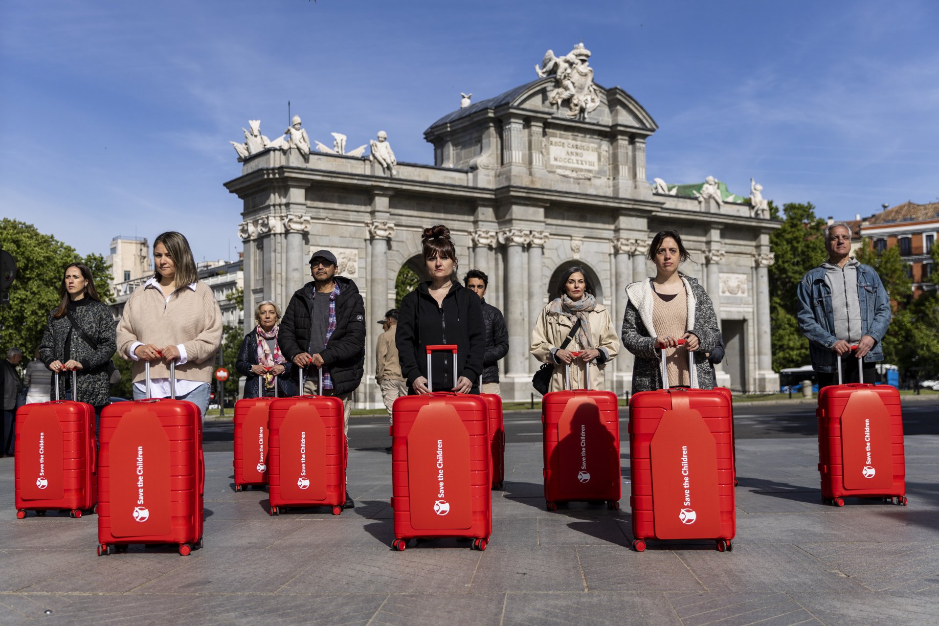 Un acto de calle, con ayuda de personas voluntarias, en la Puerta de Alcalá de Madrid para pedir que la infancia deje de ser un objetivo de guerra. Mayo 2024.