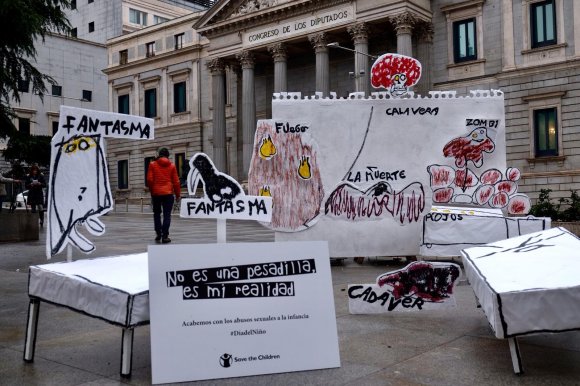 Madrid, 20 de noviembre de 2018. Con motivo del Día del Niño que se celebra hoy, Save the Children ha reproducido frente al Congreso el dibujo a tamaño real de un niño que fue víctima de abusos sexuales por parte de su padre y de su entorno durante varios años. Con esta acción la organización vuelve a denunciar en un día como hoy la violencia que cada día sufre la infancia en nuestro país. En el dibujo, el niño reflejó su habitación como una pesadilla llena de monstruos, cadáveres, fuego, fantasmas y piojos.