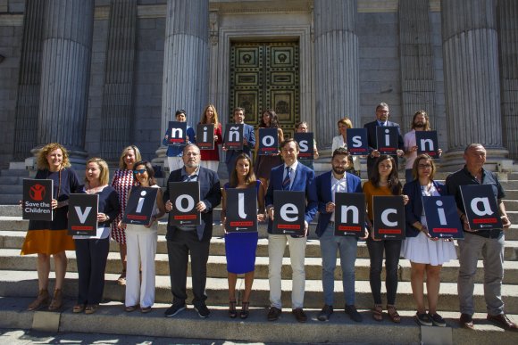 Diferentes representantes de los grupos parlamentarios han sostenido hoy junto a Ana Sastre, directora de sensibilización y políticas de infancia de Save the Children, a las puertas del Congreso un cartel con el mensaje: “Niños sin violencia”. “Los niños sufren la violencia a través de las redes sociales, en el colegio, en casa o a través de las instituciones. Sean estas formas más o menos evidentes, todas ellas son prevenibles y nunca son justificables. Por eso pedimos al Gobierno que la aprobación de esta ley lo más rápido posible.”, declara Ana Sastre, directora de sensibilización y políticas de infancia de Save the Children.